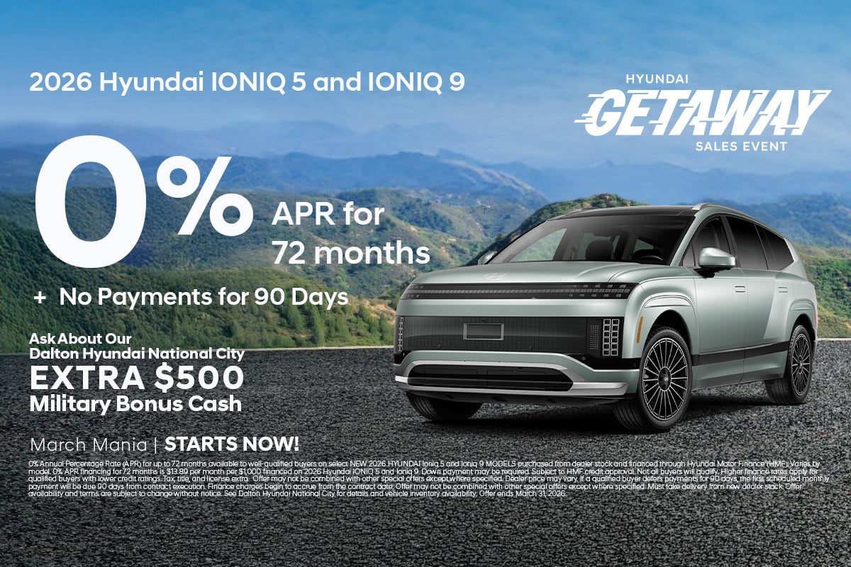0% Annual Percentage Rate (APR) for up to 72 months available to well-qualified buyers on select NEW 2026 HYUNDAI Ioniq 5 and Ioniq 9 MODELS purchased from dealer stock and financed through Hyundai Motor Finance (HMF). Varies by model. 0% APR financing for 72 months is $13.89 per month per $1,000 financed on 2026 Hyundai IONIQ 5 and Ioniq 9. Down payment may be required. Subject to HMF credit approval. Not all buyers will qualify. Higher finance rates apply for qualified buyers with lower credit ratings. Tax, title, and license extra. Offer may not be combined with other special offers except where specified. Dealer price may vary. If a qualified buyer defers payments for 90 days, the first scheduled monthly payment will be due 90 days from contract execution. Finance charges begin to accrue from the contract date. Offer may not be combined with other special offers except where specified. Must take delivery from new dealer stock. Offer availability and terms are subject to change without notice. See Dalton Hyundai National City for details and vehicle inventory availability. Offer ends March 31, 2026.