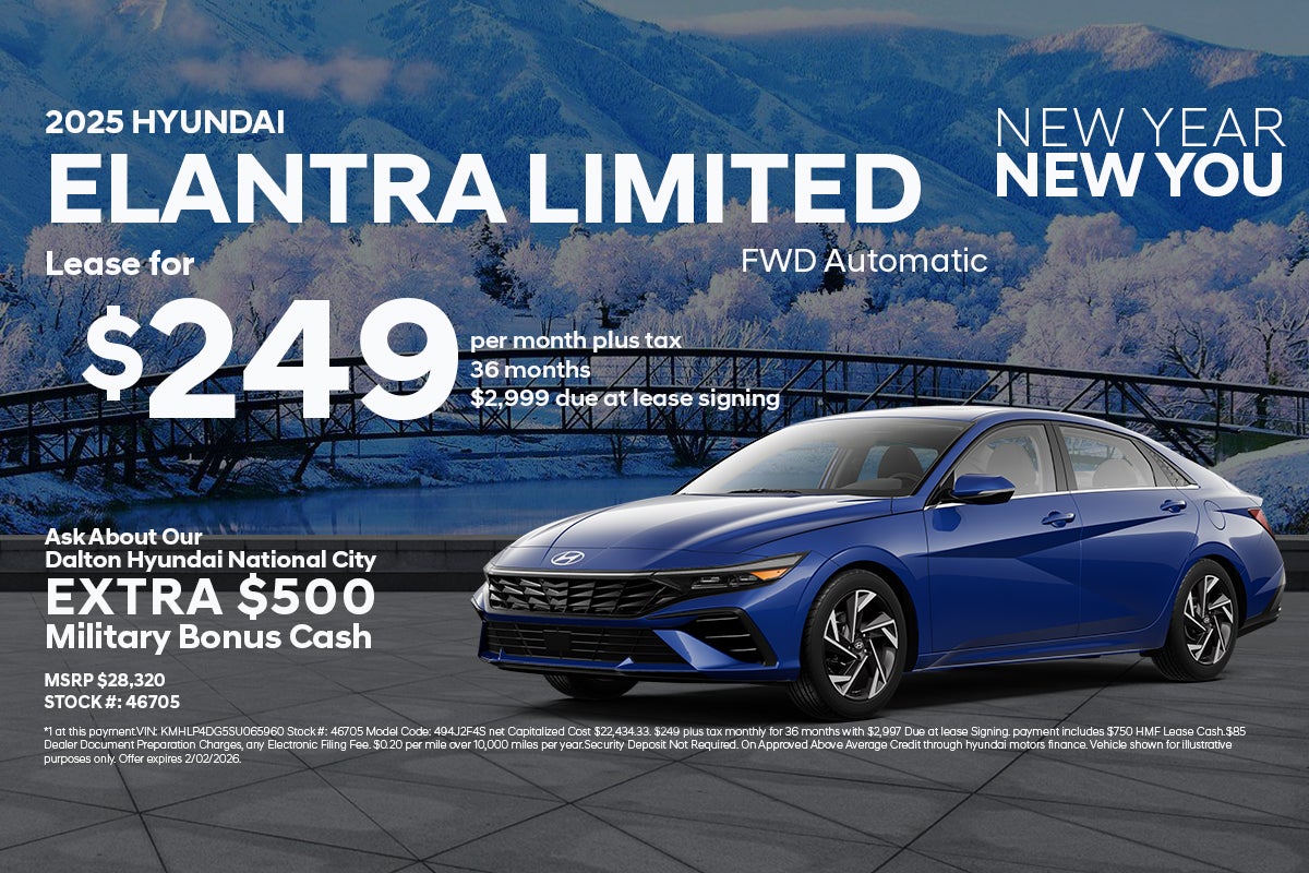 *1 at this payment.VIN: KMHLP4DG5SU065960 Stock #: 46705 Model Code: 494J2F4S net Capitalized Cost $22,434.33. $249 plus tax monthly for 36 months with $2,997 Due at lease Signing. payment includes $750 HMF Lease Cash.$85 Dealer Document Preparation Charges, any Electronic Filing Fee. $0.20 per mile over 10,000 miles per year.Security Deposit Not Required. On Approved Above Average Credit through hyundai motors finance. Vehicle shown for illustrative purposes only. Offer expires 2/02/2026.