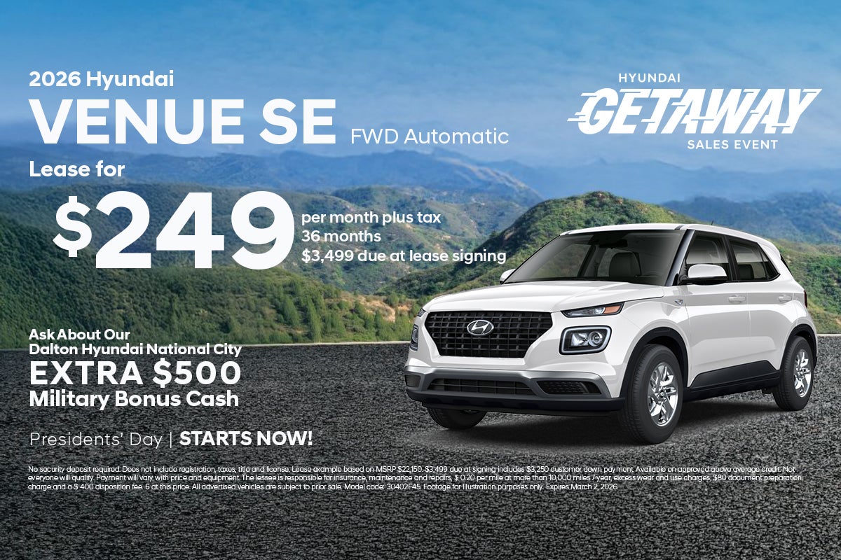 *Although every reasonable effort has been made to ensure the accuracy of the information contained on this site, absolute accuracy cannot be guaranteed. This site, and all information and materials appearing on it, are presented to the user "as is" without warranty of any kind, either express or implied, including but not limited to the implied warranties of merchantability, fitness for a particular purpose, title or non-infringement. All vehicles are subject to prior sale. Prices exclude government fees and taxes, any finance charges, $85 dealer documentation preparation charge, any electronic filing charge, any emissions testing charges and any optional equipment. Dalton Hyundai installs alarm systems on their vehicles to protect them while on dealer's premises. The advertised prices do not include the purchase of the alarm system. The anti-theft device can be purchased for an additional cost. Purchase of the anti-theft device is not required. If customer does not purchase the alarm system it will be removed prior to delivery. All advertised prices expire daily at midnight.