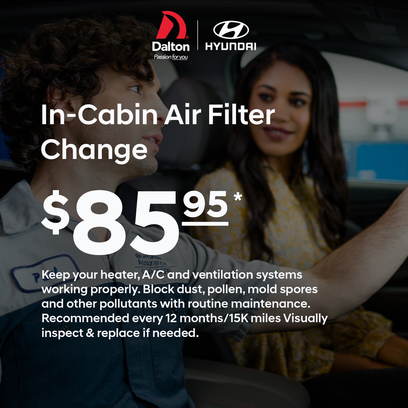 Keep your heater, A/C and ventilation systems working properly. Block dust, pollen, mold spores and other pollutants with routine maintenance. Recommended every 12 months/15K miles Visually inspect & replace if needed.