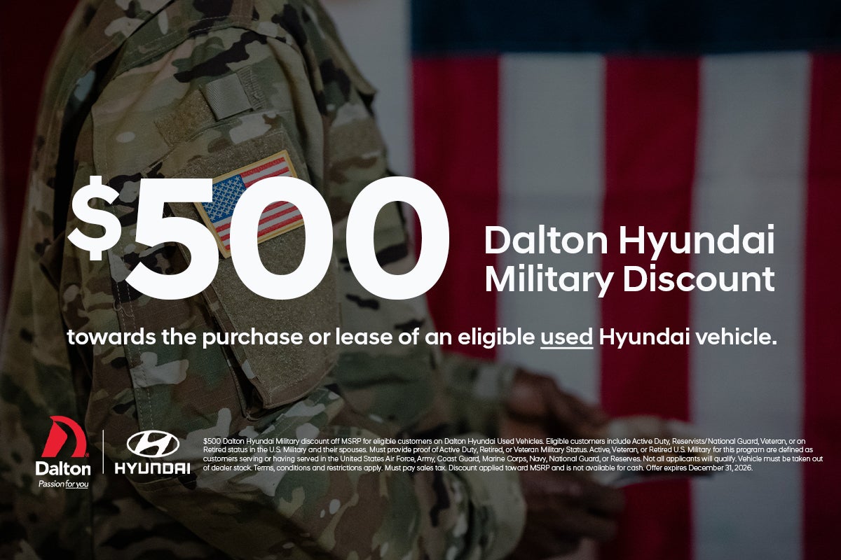 $500 Dalton Hyundai Military discount off MSRP for eligible customers on Dalton Hyundai Used Vehicles. Eligible customers include Active Duty, Reservists/National Guard, Veteran, or on Retired status in the U.S. Military and their spouses. Must provide proof of Active Duty, Retired, or Veteran Military Status. Active, Veteran, or Retired U.S. Military for this program are defined as customers serving or having served in the United States Air Force, Army, Coast Guard, Marine Corps, Navy, National Guard, or Reserves. Not all applicants will qualify. Vehicle must be taken out of dealer stock. Terms, conditions and restrictions apply. Must pay sales tax. Discount applied toward MSRP and is not available for cash. Offer expires December 31, 2026.